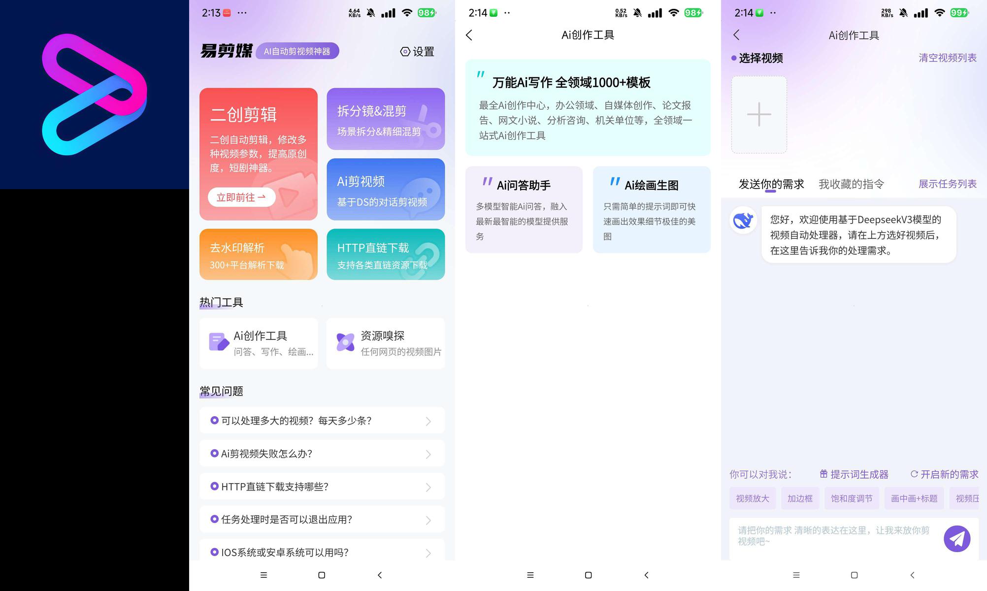 【应用简介】行业首创的对话式AI视频剪辑工具,支持批量自动视频处理,指令收藏等强大功能,多平台使用,免费无广告。易剪媒deepseek剪辑软件是一款基于deepseekV3模型打造的ai视频剪辑软件。有了这款软件您无需再去剪辑软件一步步逐帧剪辑视频,只需要通过我们的软件导入您的视频,然后输入你的剪辑需求就可以快速完成剪辑。而且我们的软件还支持批量剪辑可以多个视频一并剪辑,提升剪辑效率。