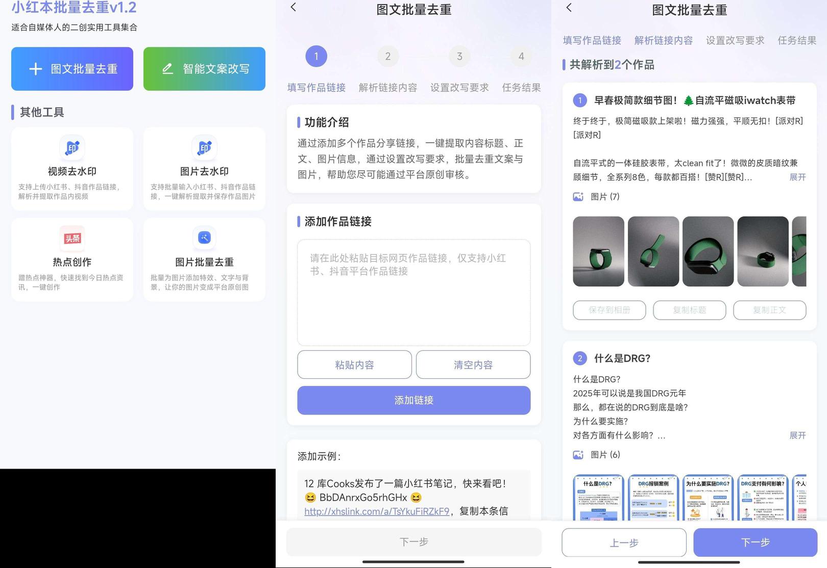 【软件介绍】 是一款面向小红书抖音的图文批量改写工具,可以批量输入小红书、抖音作品分享链接;软件会自动根据链接批下载作品内容,并根据自由设定的图片去重配置、文案改写配置,批量对小红薯、抖音作品进行处理改造,以达到原创效果,