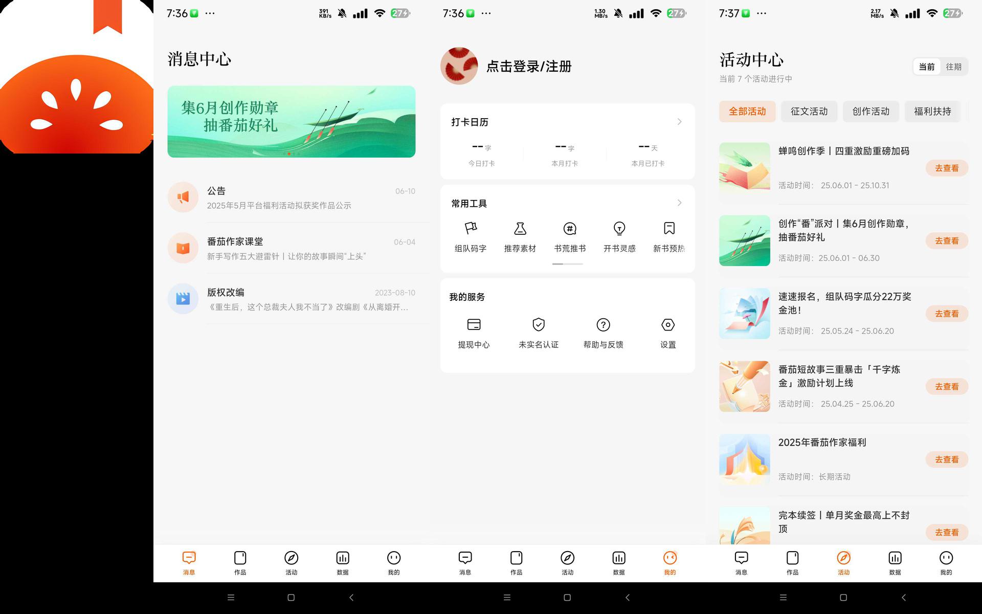 【消息】 消息通知:审核结果、签约进度、互动消息实时同步 活动公告:多种征文/爆更活动及时发布,魁星星火等奖励计划每月更新名单