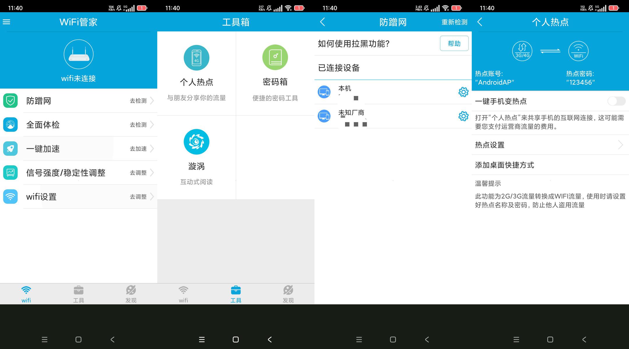 【应 用 介 绍】:WiFi管家(防蹭网神器)专业保护Wi-Fi安全,防止Wi-Fi密码泄露。 本软件能够帮助用户查看当前WiFi上连接的设备数量、型号、Mac地址、IP地址等信息。一旦您查看到的陌生设备Mac地址,您的网络可能被蹭网了。软件的"防蹭网大全"一步一步教您设置路由器安全。 安全匿名是Wi-FI管家的基本要求,我们致力于更快更极致的体验。需要的朋友快来下载吧!