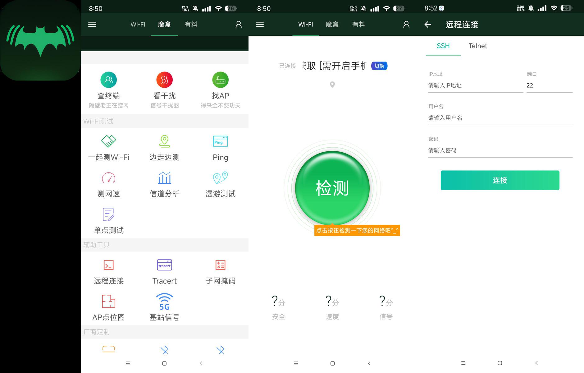漫游测试、ping、扫一扫、测网速、单点测试、telnet、蓝牙遥控,你想要的应有尽有。