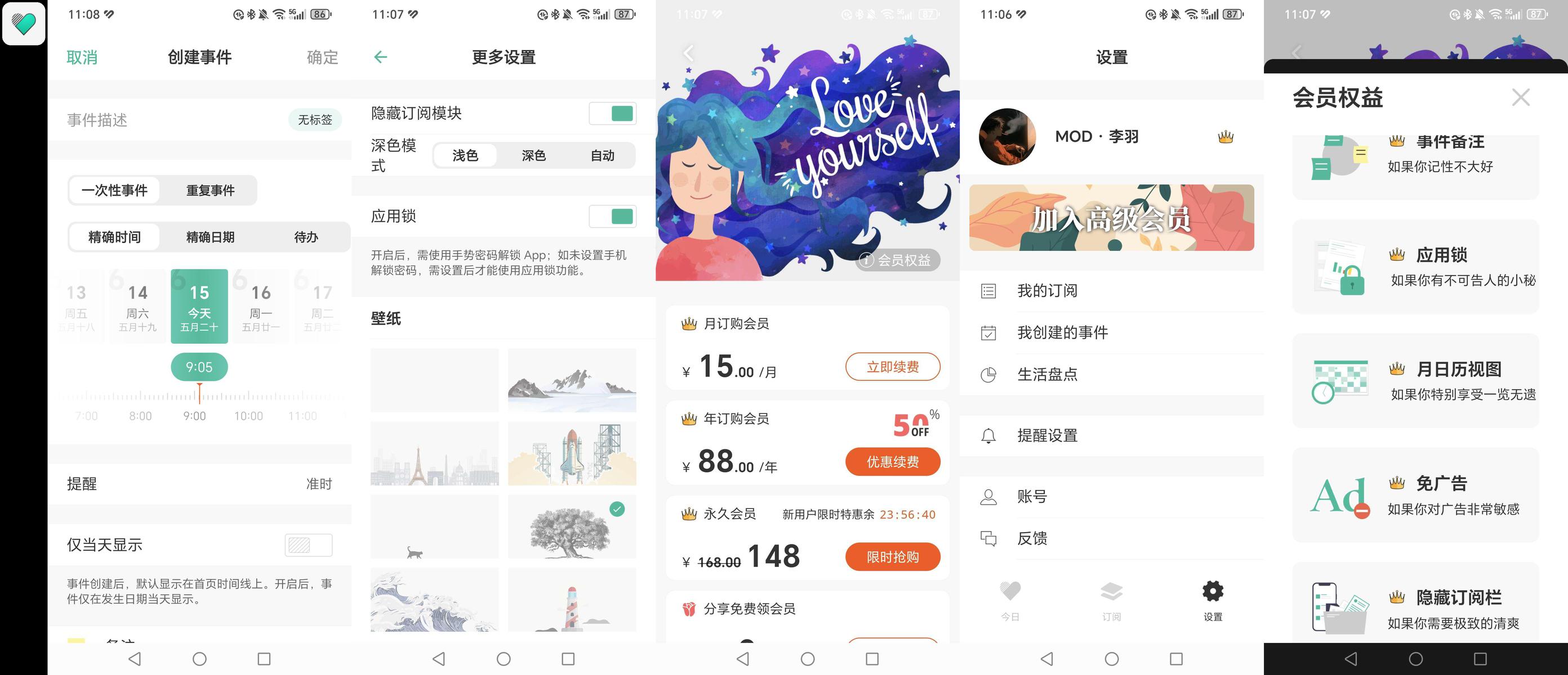 ●● 加入高级会员开启更多功能 Dislike 的基础功能完全免费,足以满足大多使用场景。如果你对 Dislike 有更多的功能需求,可以加入 Dislike 高级会员获取以下专属功能: → 月日历视图 → 生活盘点 → 事件备注笔记 → 应用锁 → 专属壁纸 → 在菜单栏单独显示日历 → 隐藏订阅栏 希望 Dislike 可以帮一点忙,也衷心祝愿尘世间的每个人都获得幸福。