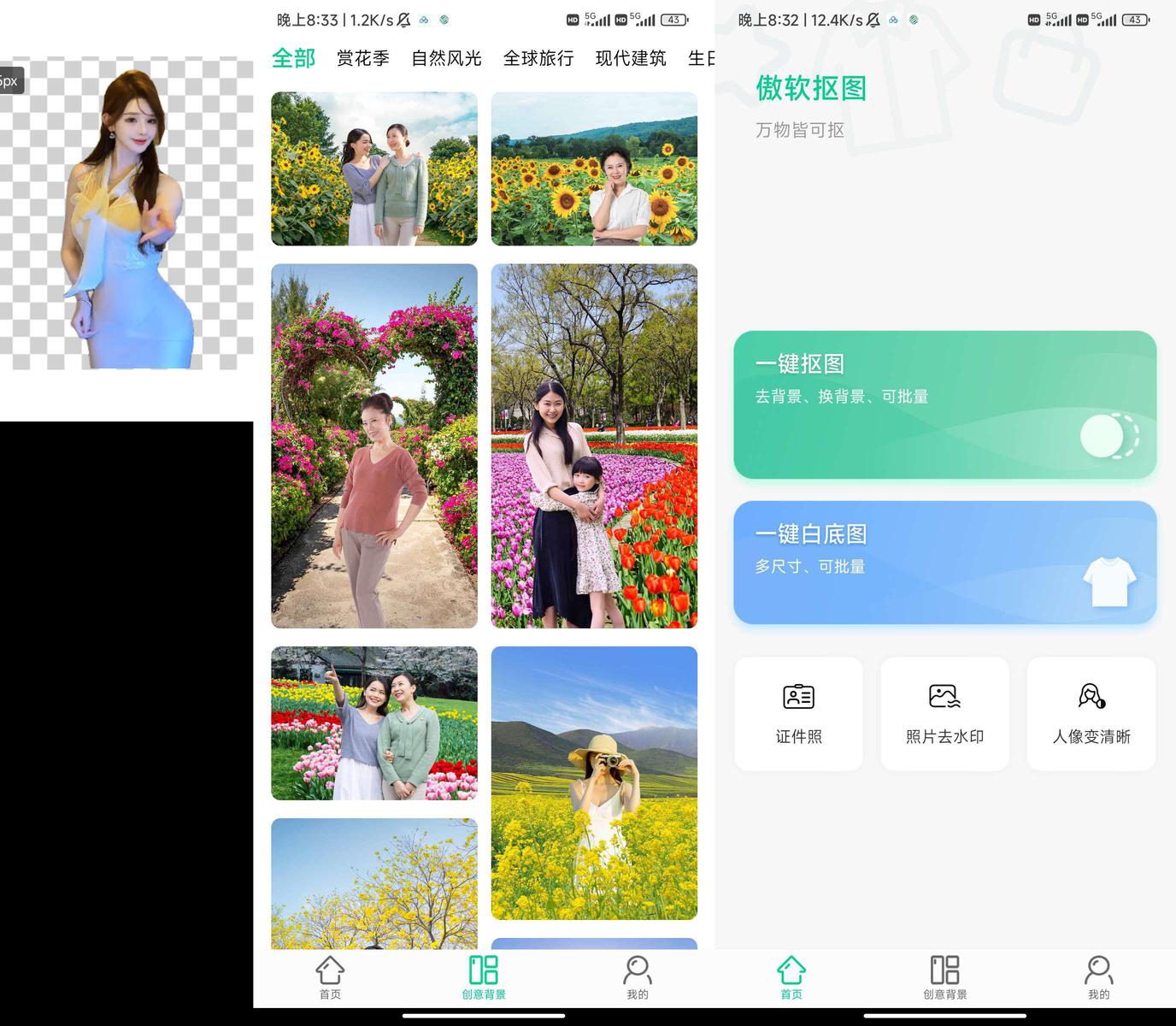 【官方介绍】:傲软抠图,智能抠图,只需一步,万物皆可抠 不用ps,一键传图,智能识图,秒速出图,手机也能抠出专业效果 傲软抠图———一站式专业级抠图工具,功能齐全,0基础小白、新手轻松上手,快速作图,一键生成精美海报,让抠图更简单,让设计更有趣! 【一键抠图】采用人工智能技术,精准智能识别图片中的人像或物体,秒速完成抠图;支持一次性批量抠图,一次性上传30张图片,即刻开始自动抠图,完成后一键保存全部透明背景图,效率瞬间乘以30! 【智能手动优化】如果对自动抠图的结果不满意,傲软抠图还支持智能手动抠图,可以任意保留、擦除抠图区域,也可以使用魔棒功能把控细节,手动抠图也可以智能起来!同时支持放大/缩小、移动、复制等功能,让抠图更加注重细节! 【一键白底图】可自动识别需要保留的主体,一键生成白底图片;支持批量白底图,适合电商、各大视频平台使用;并且提供电商专门使用的白底图片尺寸,另外还可以自定义图片尺寸,自由设置图片大小;同时还准备了日常生活中常用的图片尺寸。 【制作证件照】支持证件照换底色,蓝色、白色、红色、灰色等常用证件照底色都有,准备了热门的证件照规格:一寸、二寸、小一寸、小二寸、大一寸、社保证等;普通照片也可以转证件照。 【消除笔】智能消除任何不想要的物体,例如:LOGO,商标,文字等,可手动调整画笔大小,涂抹区域,让图片更加干净整洁。 【人像变清晰】一键传图,自动修复,可以将模糊照片、低质照片、斑驳痕迹快速修复,一键复原高清人像。 【海量创意背景】内置海量背景模板并且定期更新,创意头像、节日模板、热点模板等,自由更换图片背景,也可上传自定义背景图,玩转创意设计,释放各种奇思妙想。 【应用场景广泛】电商平台、社交媒体、视频平台、市场营销、个人生活、专业摄影等,全行业模板素材覆盖,应用广泛! 傲软抠图