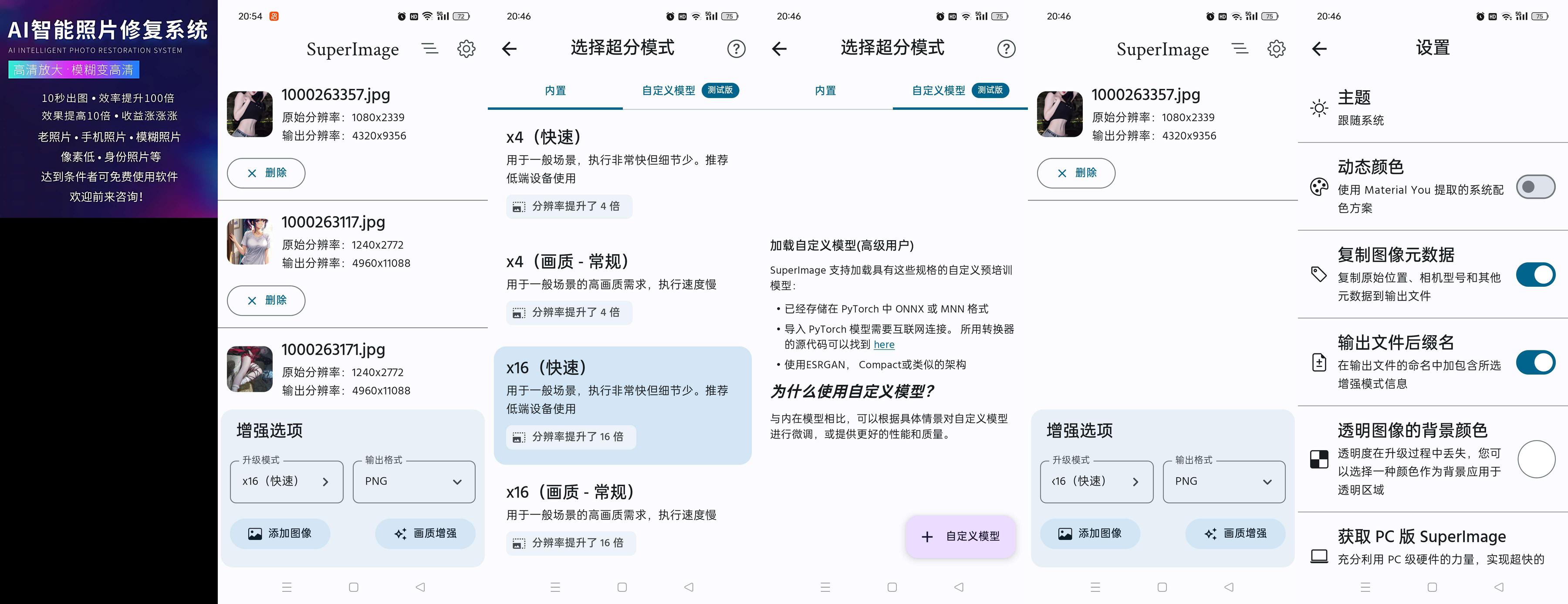 SuperImage Pro 是一个基于神经网络的图像放大 构建, 采用 MNN 深度学习框架和 Real-ESRGAN 算法。 通过利用设备 GPU的强大功能,Superlmage能够 放大和恢复图像的细节, 而无需将图像上传到互联 网, 从而确保数据安全。