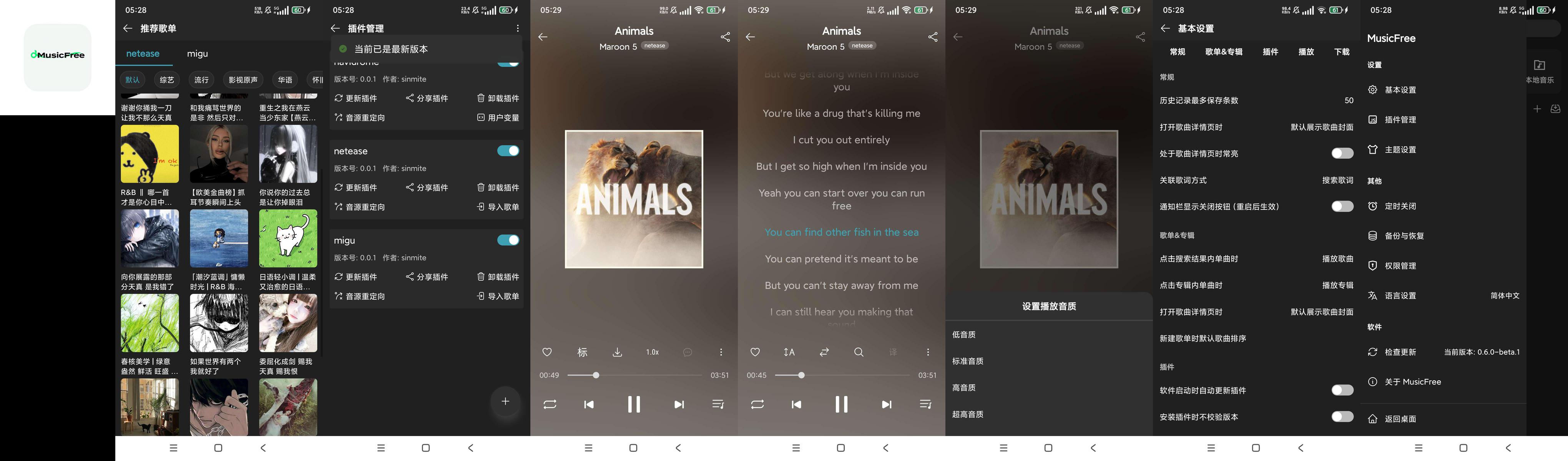 的免费音乐播放器,目前仅支持Android和Harmony OS。支持导入安装插件,任何音源,所有的搜索、播放、歌单导入等功能全部基于插件。插件支持的功能:搜索(音乐、专辑、作者)、播放、查看专辑、查看作者详细信息、导入单曲、导入歌单、获取歌词等。