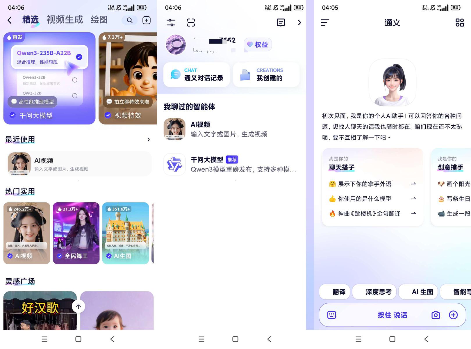 【应 用 介 绍】:通义是你实用、贴心的个人AI助手,是阿里巴巴的原生大模型官方应用。 依托于Qwen3混合推理模型,wanx视觉生成模型等阿里巴巴大模型,用更快的速度、更加全面强大的功能为你搜索信息、分析总结、提供生活和工作的专业建议,同时也是你的聊天搭子,倾听你的苦闷和烦恼,跟你畅聊。