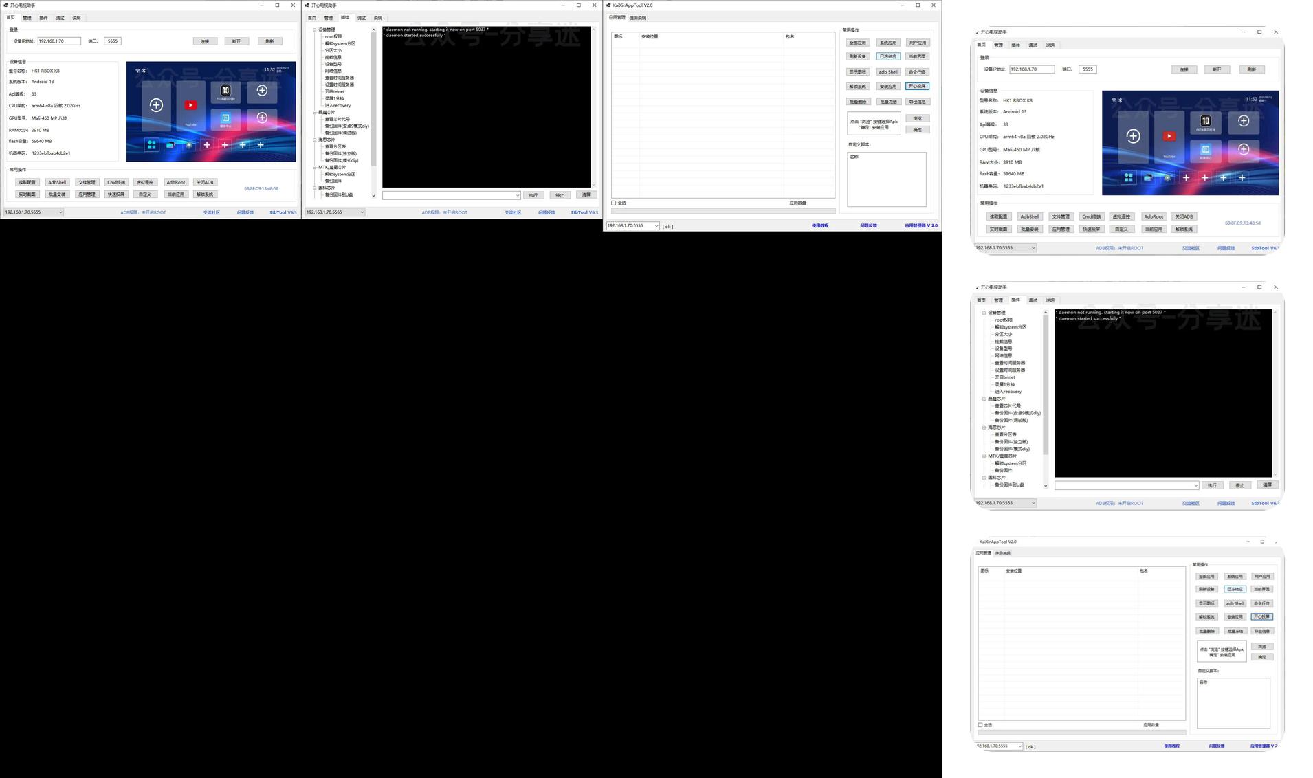 开心电视助手是由@剑心开发的一款针对安卓设备打造的远程管理工具。它不仅支持便捷安装第三方APK、远程截图、虚拟遥控器等基础功能,还提供了一键去广告、优化系统、刷第三方ROM固件等高级功能。该工具支持自定义加载bat批处理、py脚本等插件,可以实现免拆批量刷盒子和一键备份机顶盒系统固件。新版6.3增加了检测串号异常功能,修复了命令行输入未知bug,并增强了快速投屏功能,新增了虚拟显示器支持。无论是家中老旧的电视或盒子,还是最新的旗舰设备,开心电视助手都能帮助你深度管理和优化它们。