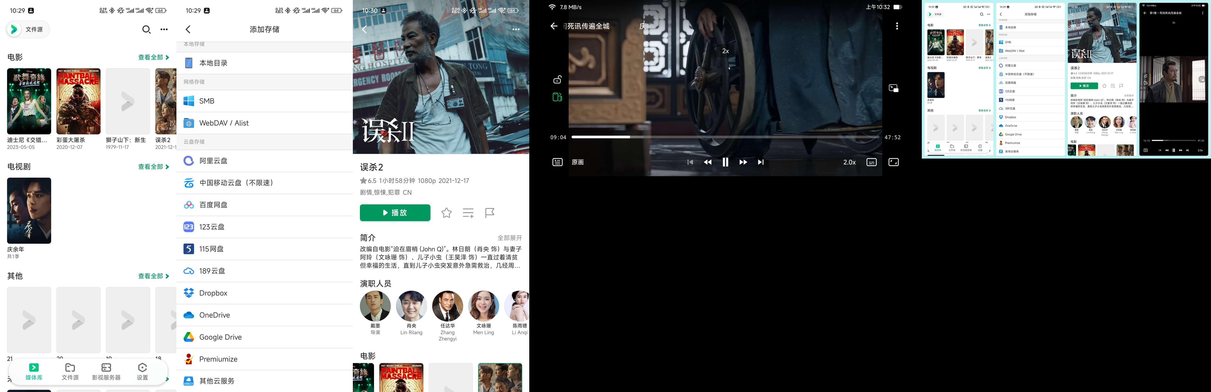 支持本地文件、SMB、WebDAV / Alist、阿里云盘、中国移动云盘、百度网盘、123云盘、115网盘,以及Emby、Jellyfin、Plex、飞牛私有云等云服务器,自动刮削整理影视资源,支持倍速播放、在线字幕、小窗播放等功能