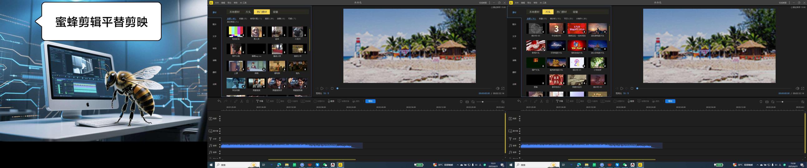 【软件介绍】蜜蜂剪辑电脑版是一个免费的视频剪辑软件,拥有齐全的视频创作功能,为用户提供了丰富的素材、模板资源,可以便捷地进行创意实现。界面简洁无广告,操作简单,小白用户也能轻松使用。支持横、竖屏视频剪辑,满足不同的观众需求