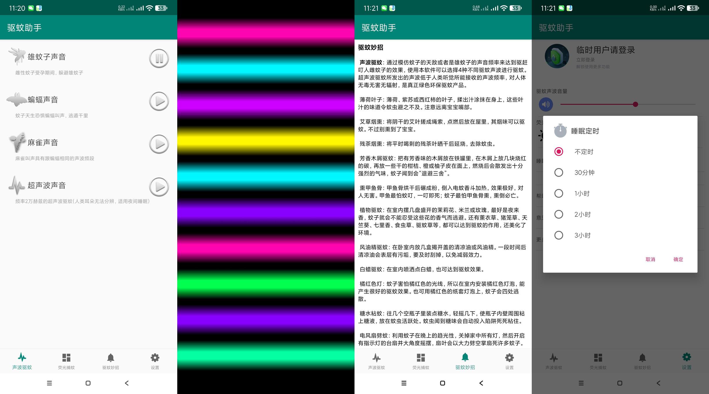 软件基于仿生学原理设计,采用绿色环保的驱蚊方式,包含两大功能模块,多种驱蚊方式可供选择: