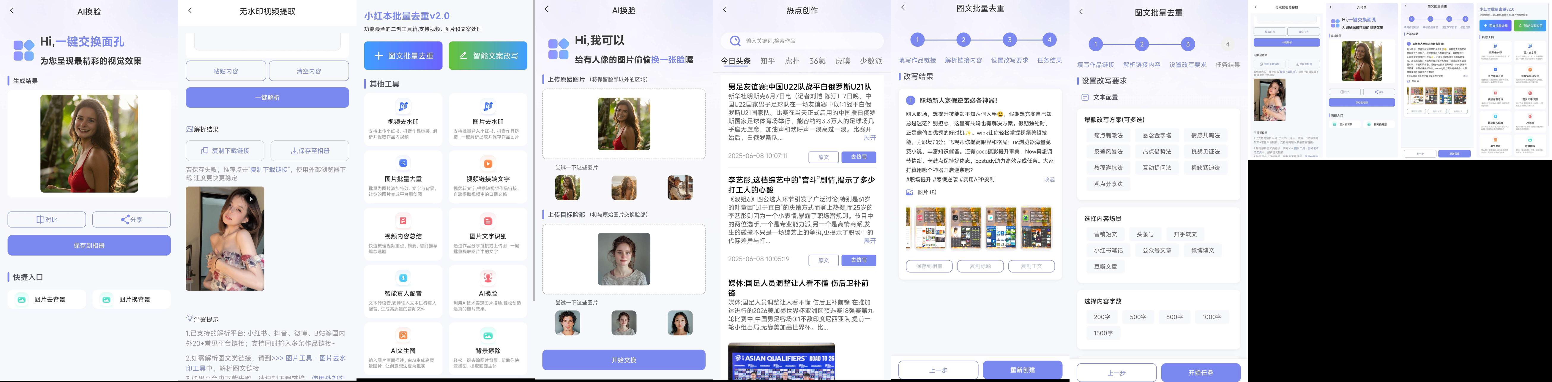 这是一款专为小红书和抖音用户设计的图文改写工具。它支持批量输入小红书、抖音作品分享链接,自动下载作品内容,并根据设定的图片去重配置和文案改写配置,达到原创效果。软件功能丰富,包括图文批量去重、智能文案改写、视频去水印、图片去水印、图片批量去重、视频链接转文字、视频内容总结、图片文字识别、智能真人配音、AI换脸、AI文生图和背景擦除等。每日定时更新热点新闻库及行业赛道爆款文案库,无需登录、无广告、打开即用。