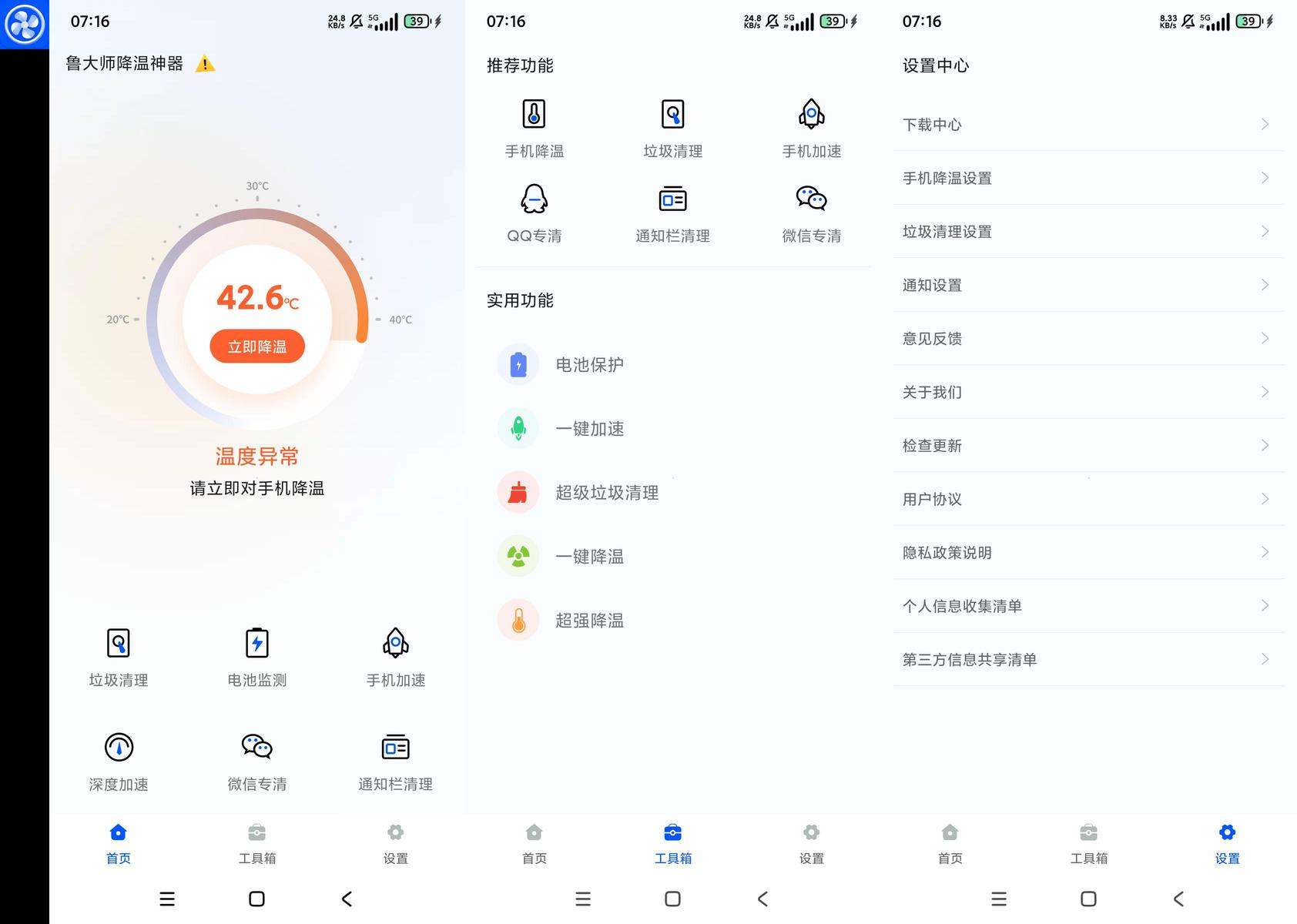 【应 用 介 绍】:鲁大师降温神器App是针对Android系统而开发的一款手机降温软件,该软件拥有多项传感器检测温度技术,能够人性化的高温提醒,并智能的进行降温操作,让你的手机轻松一键降温。另外软件界面简洁大方,使用操作简单,可以帮助用户一键解决电话时屏幕过热、充电时电池爆炸、游戏时手机过烫的问题,让你的手机正常流畅运行。