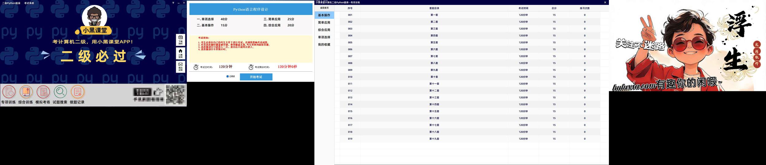 小黑课堂计算机二级Python题库软件:该软件包含了19套真题(新增了2024年新考的一套真题),题型涵盖单项选择、Python基本操作、Python简单应用和Python综合应用题。软件支持模拟考试和实时评分功能。考试95%的题目均是该题库里的原题,并且题库软件完全免费使用。