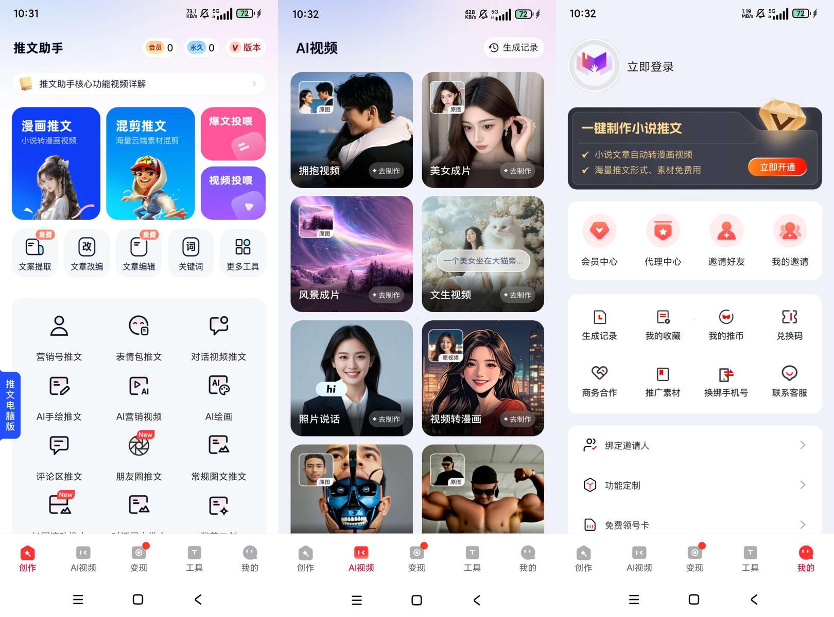 【应 用 介 绍】:推文助手是一款小说推文视频领域创作者服务工具平台应用。致力于服务短视频创作者更高效更方便的产出作品,获取最大化的作品收益。(部分功能需要会员 用免费的功能即可)