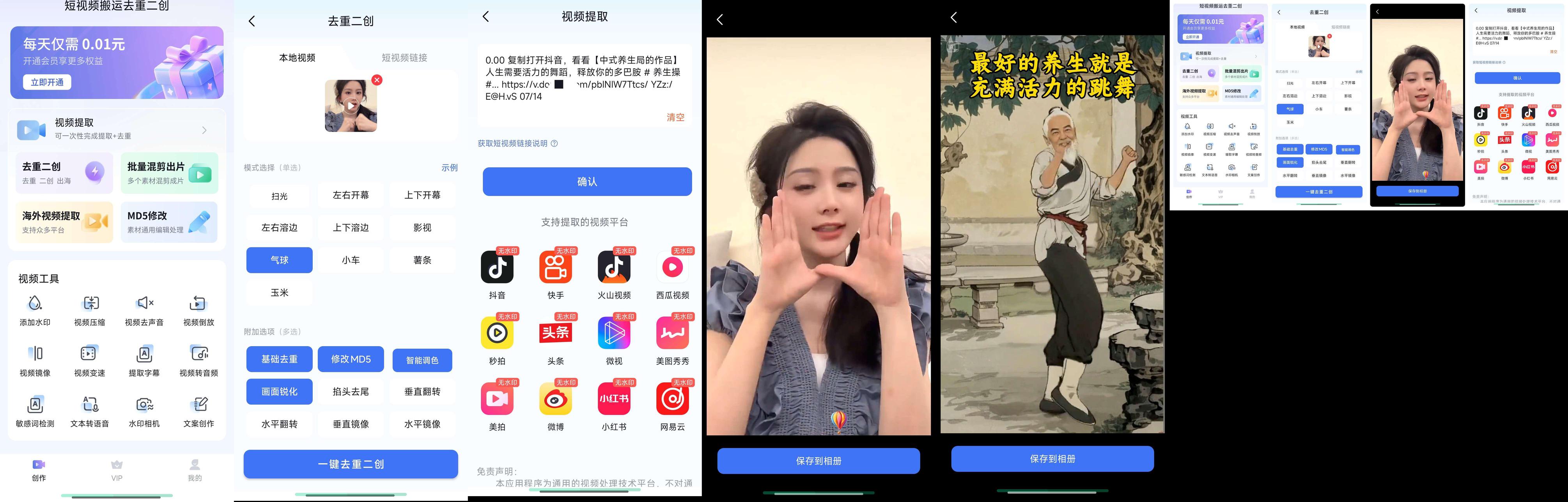 短视频搬运去重二创是一款功能强大的视频处理工具,专为短视频创作者设计。该应用提供了丰富的功能,帮助用户轻松完成视频提取、去重、二创等操作。以下是该应用的主要特点和功能: