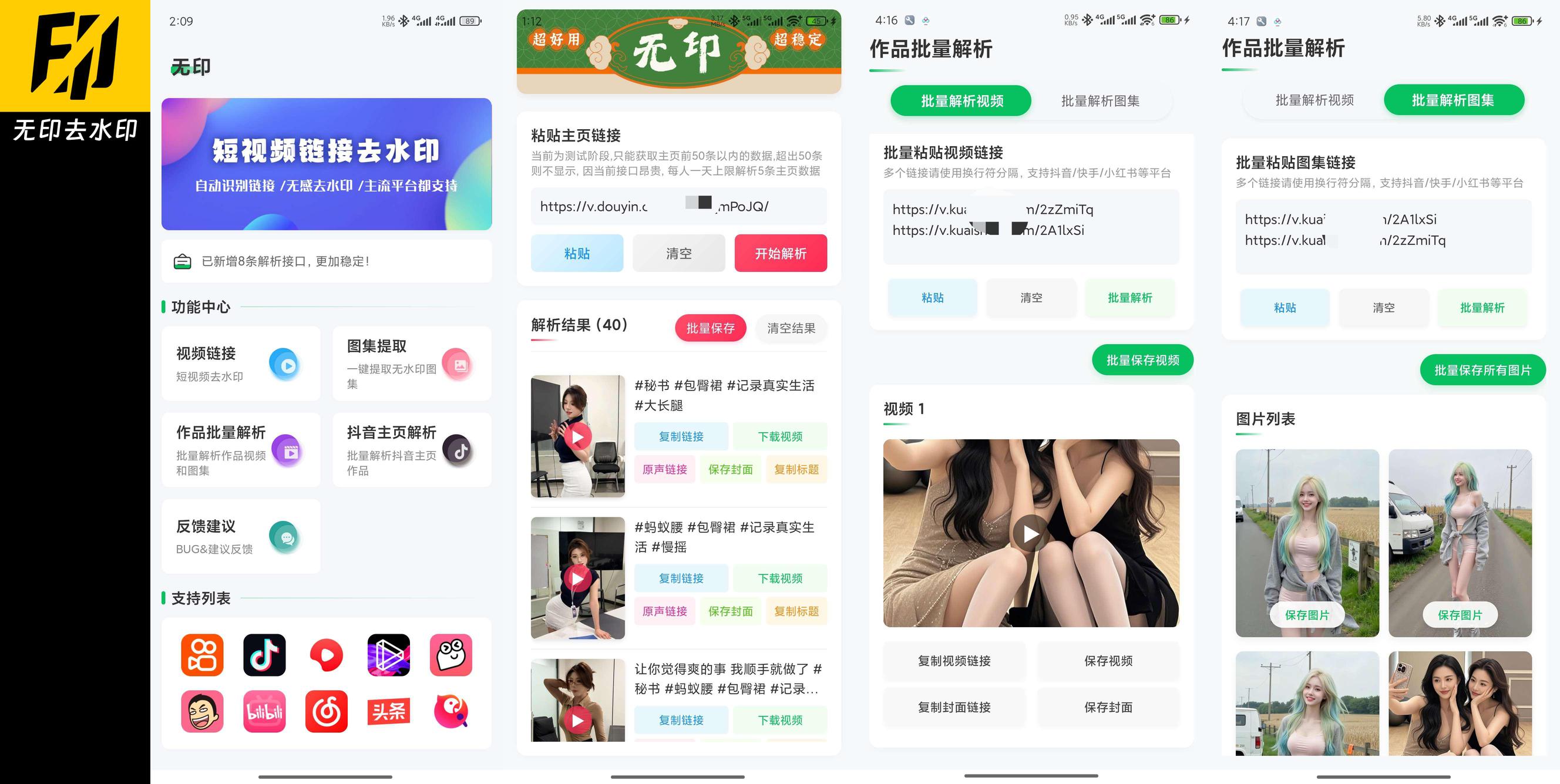 支持:快手,抖音,小红书,哔哩哔哩,等多款应用去水印,支持图集解析批量下载