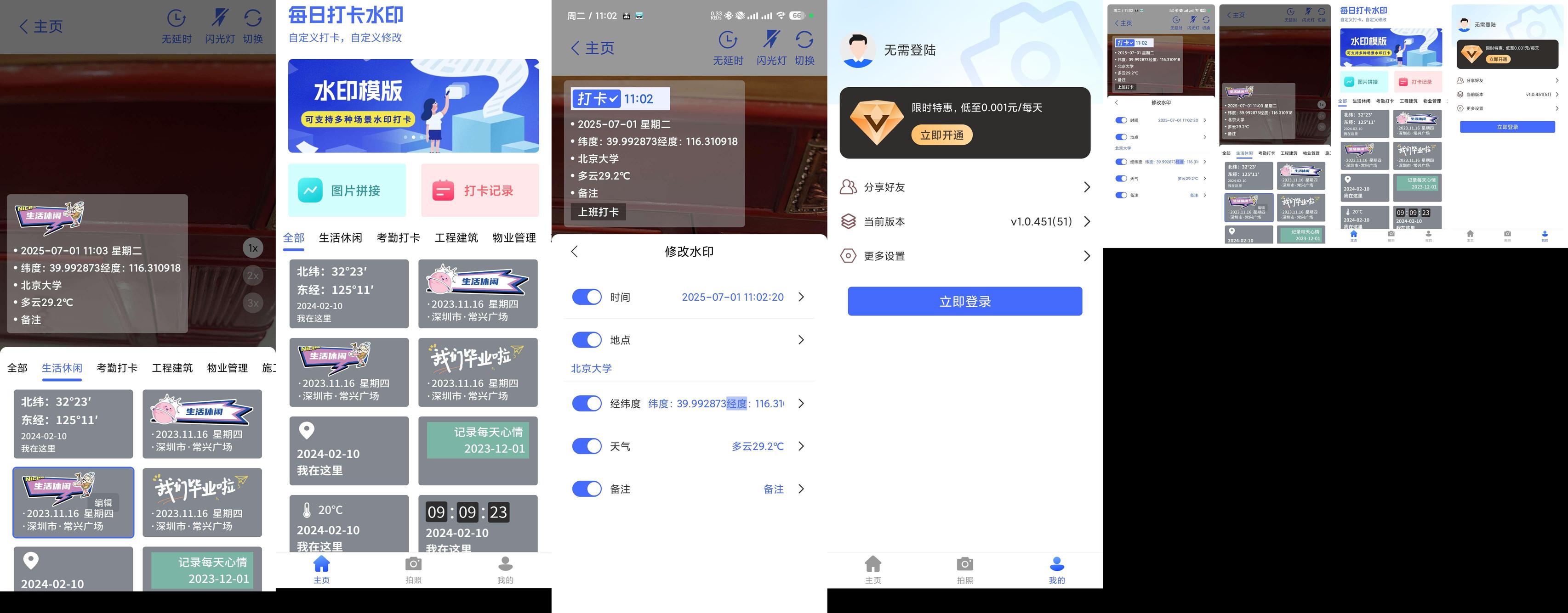 支持更改时间和地点,各种行业的打卡模板,视频水印
