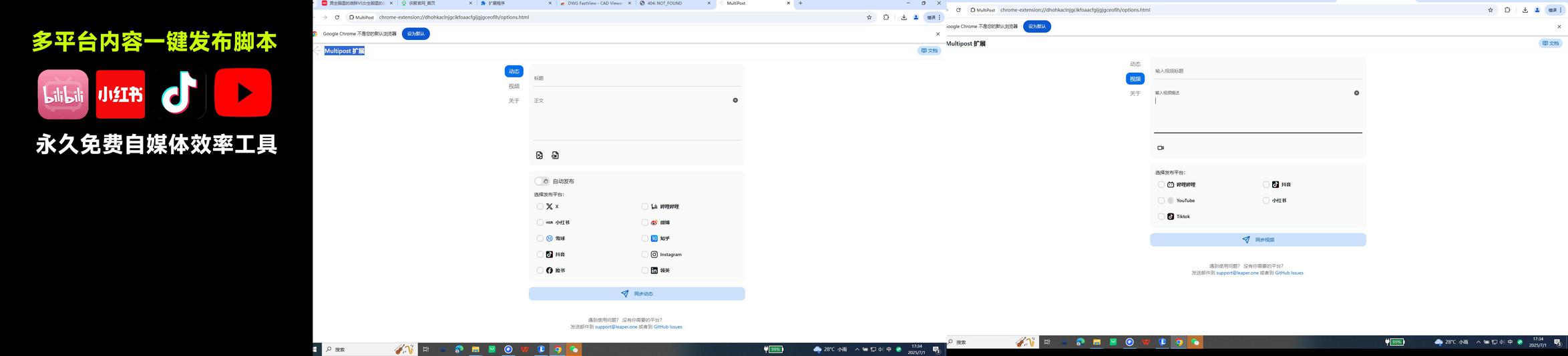 【软件介绍】一个浏览器扩展,可以帮助用户一键将内容同步发布到多个社交媒体平台。支持同步发布到知乎、微博、小红书、抖音等十多个主流平台;免登录、免注册、免 API Key;支持发布文字、图片、视频等多种内容形式。清喜已亲测可以使用,支持谷歌和edge浏览器
