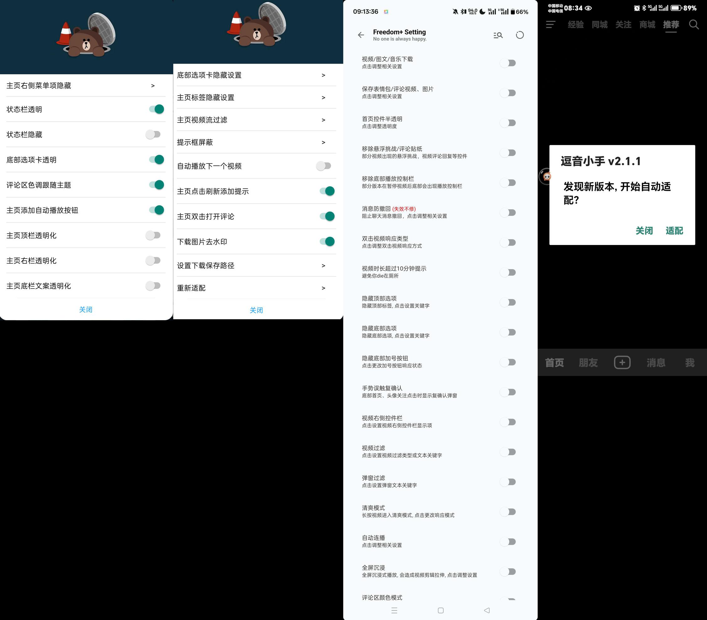 七:隐藏底部选项,隐藏底部加号按钮,手势防触摸,视频右侧控件,视频和弹窗过滤,清爽模式,自动连播,评论区深色模式等