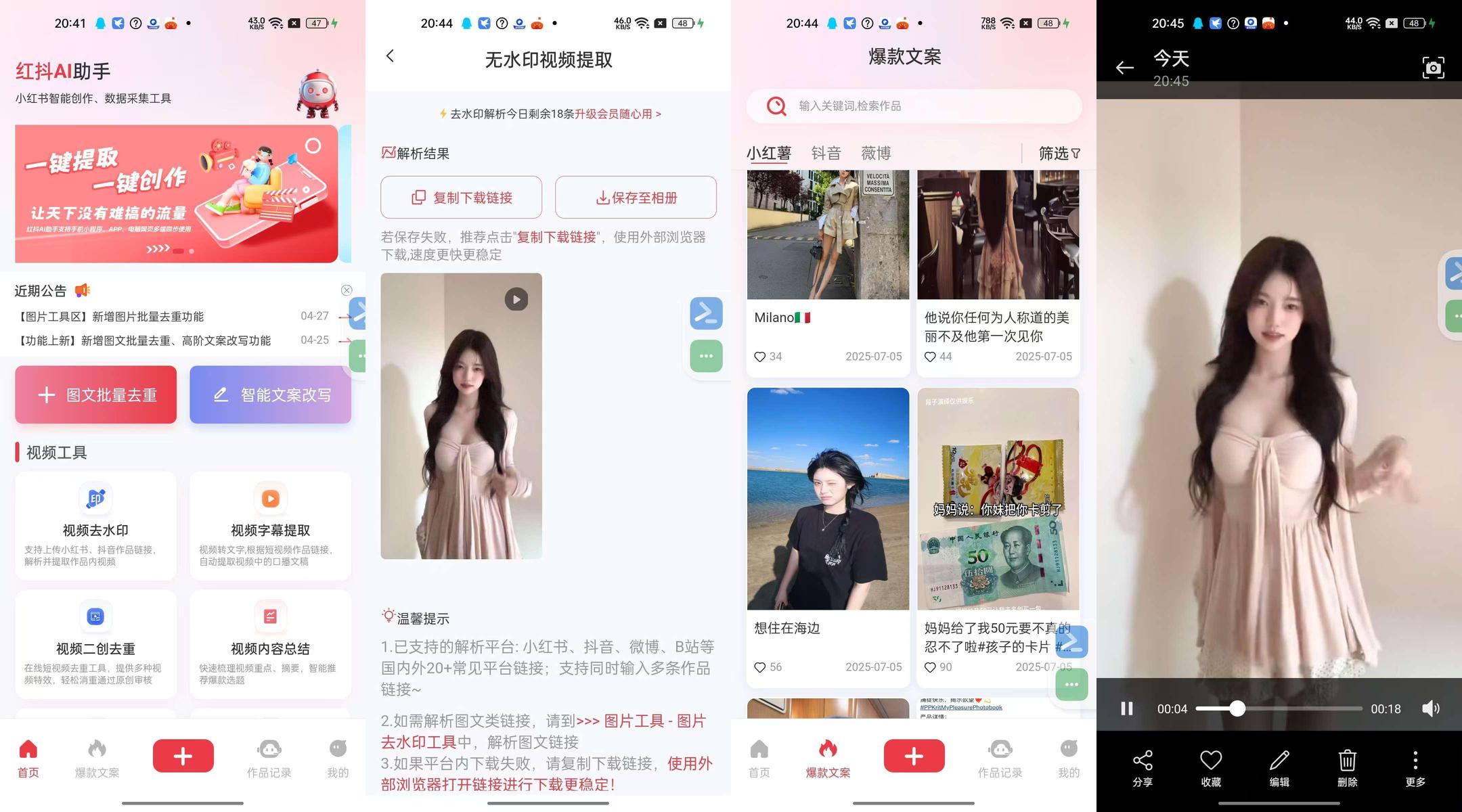 红抖AI是自媒体创作利器。支持多平台内容提取,可一键解析小红书、抖音等链接。拥有AI批量仿写功能,能生成爆款文案;还具备视频去水印、转文字、真人配音,以及图片去背景、AI换脸等丰富功能,助你高效产出优质内容。