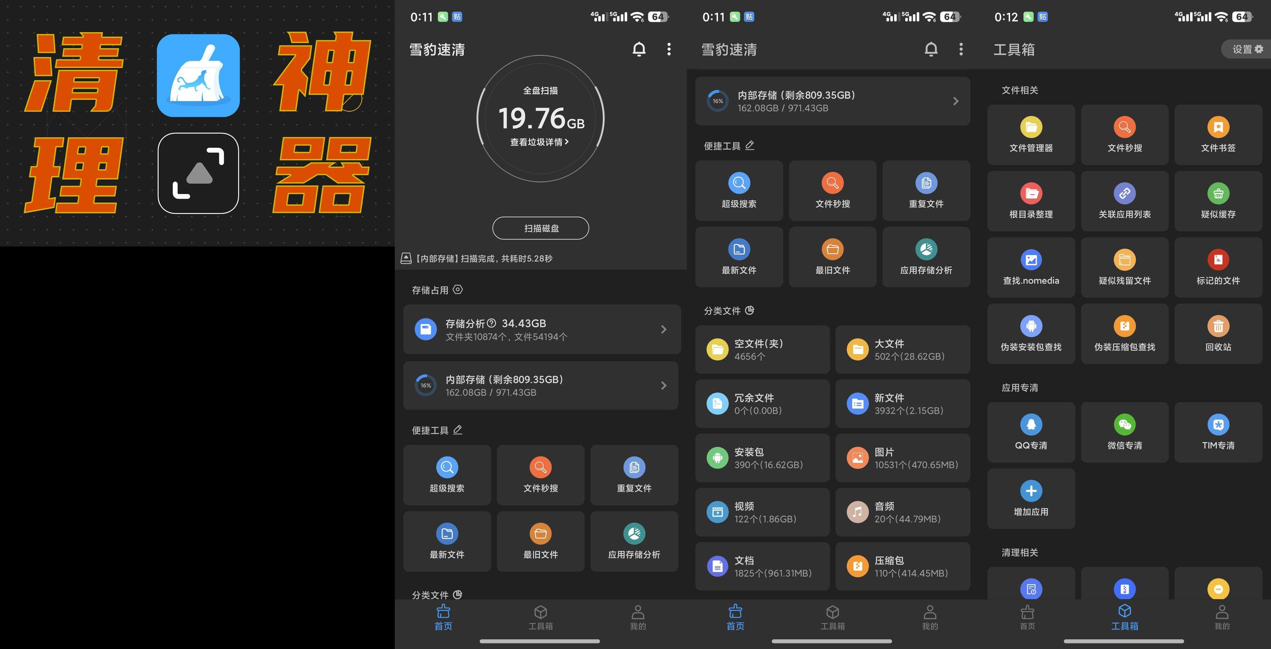 【应用简介】雪豹速清 APP 智能文件分类、一键清理垃圾。 APP分类:实用工具 APP介绍:功能介绍:一、自动全盘扫描功能空文件夹、大文件、新文件、安装包、图片..