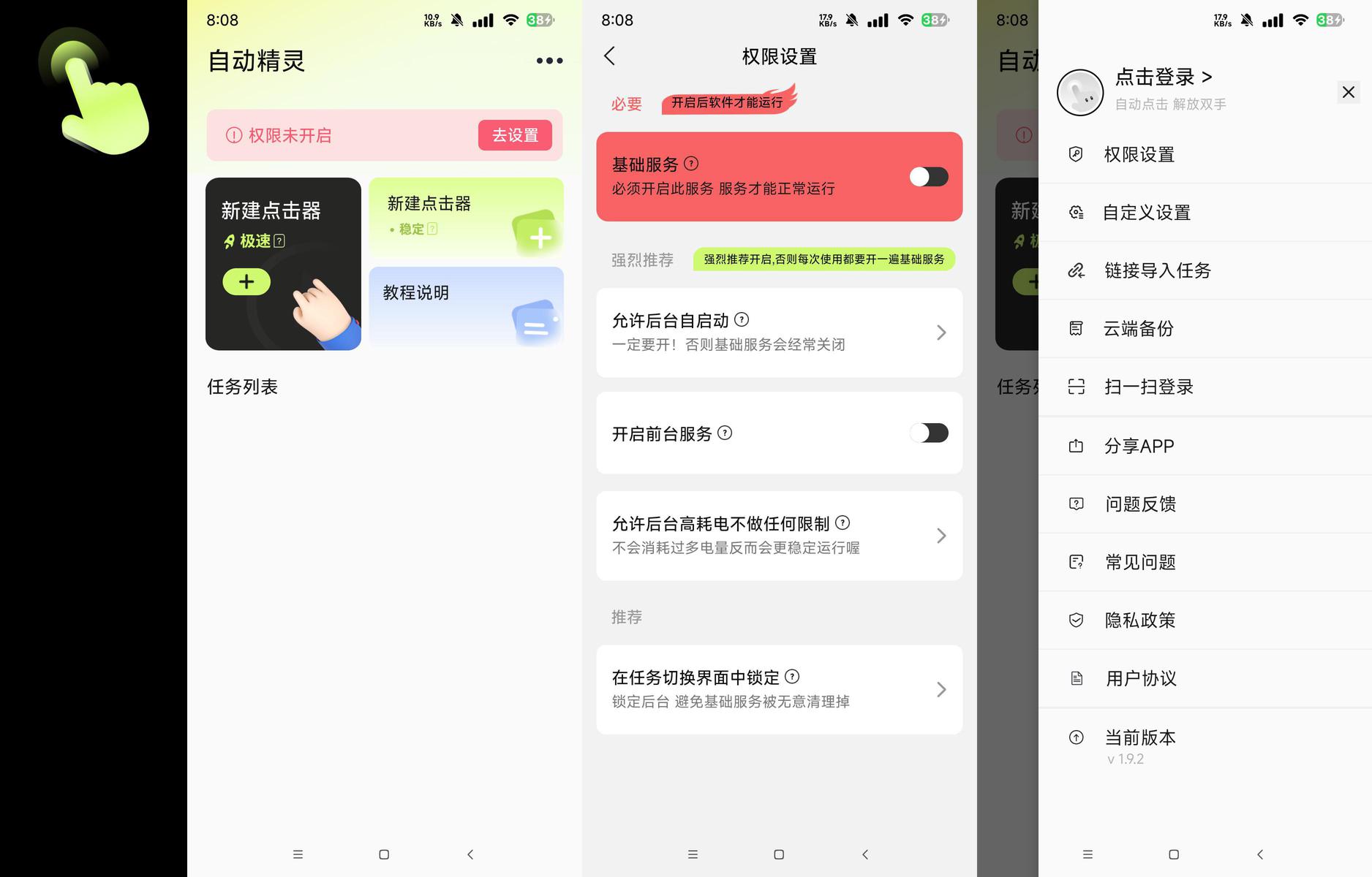 【软件简介】这是一款智能的自动点击器免费应用,可以自动模拟点击,轻松实现按键精灵的效果,它帮你自动点击屏幕,无需ROOT权限。可以方便添加点击位置,设置点击速度,是一款连点器免费应用。他能随心创建配置执行点击流程的软件,无任何限制,自由发挥想象,能够按照你的需求执行,可以自动点击操作任何你想要执行的行为。