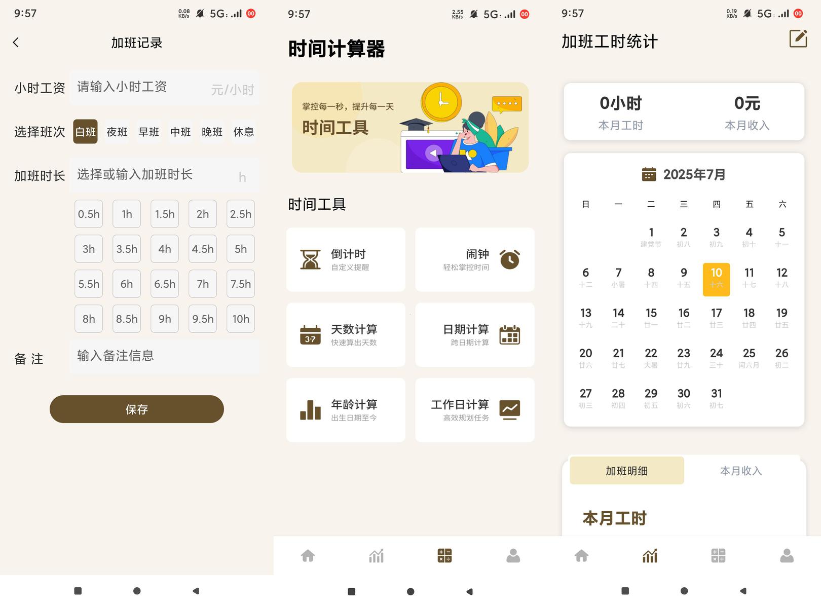 【实时记录】·实时收入追踪,轻松掌握每日工作时长·可视化收入展示,直观了解收入增长【多维度收入统计】·日收入实时计算,随时了解今日所得·月度收入汇总,清晰掌握月度工资·加班明细统计,直观查看加班收益【灵活工作制度支持】·支持双休、单休、大小周等多种工作制·自定义工作时间,