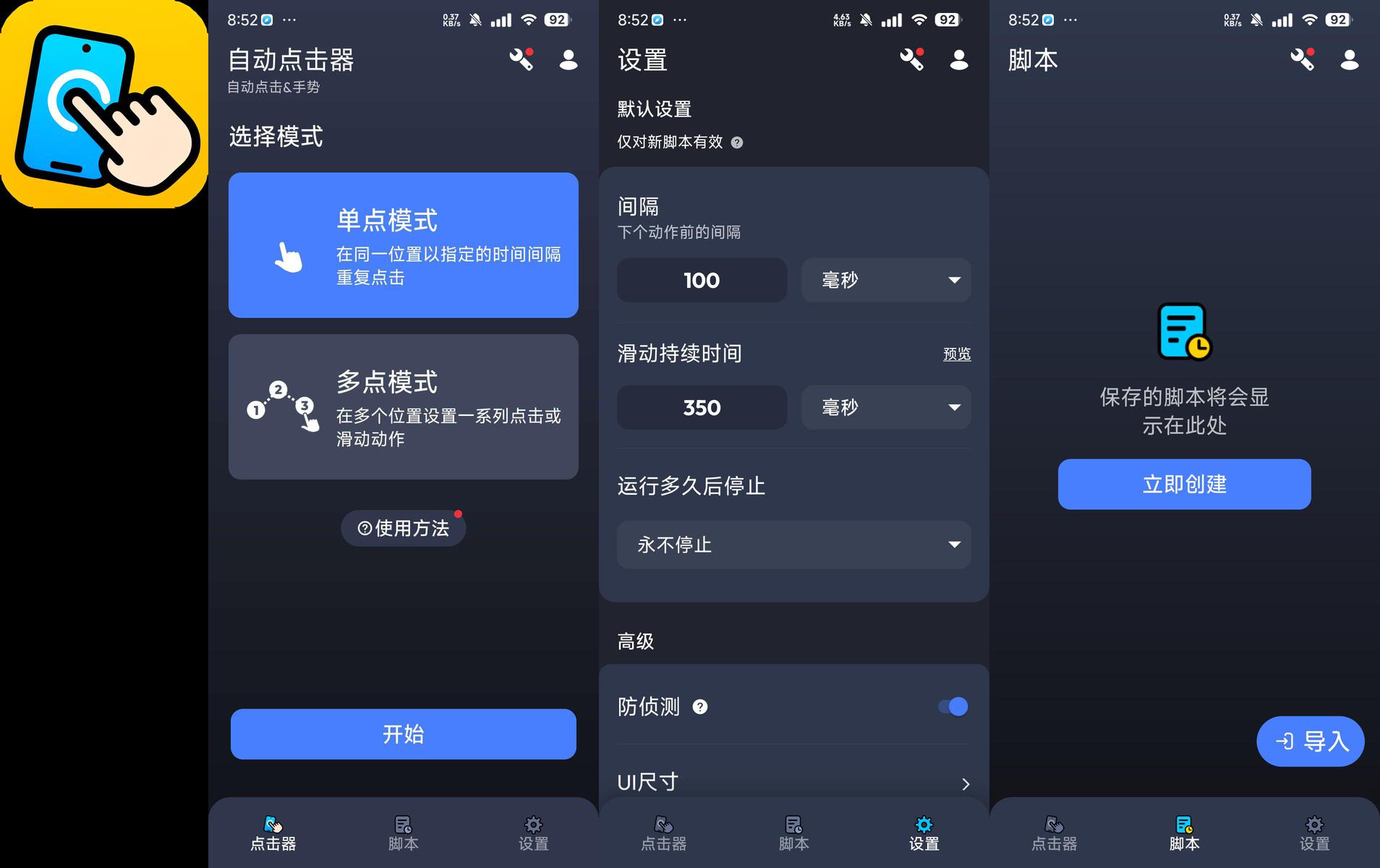 【应用简介】自动点击器帮你自动点击屏幕,无需ROOT权限。可以方便添加点击位置,设置点击速度。解锁会员 内置防检测。