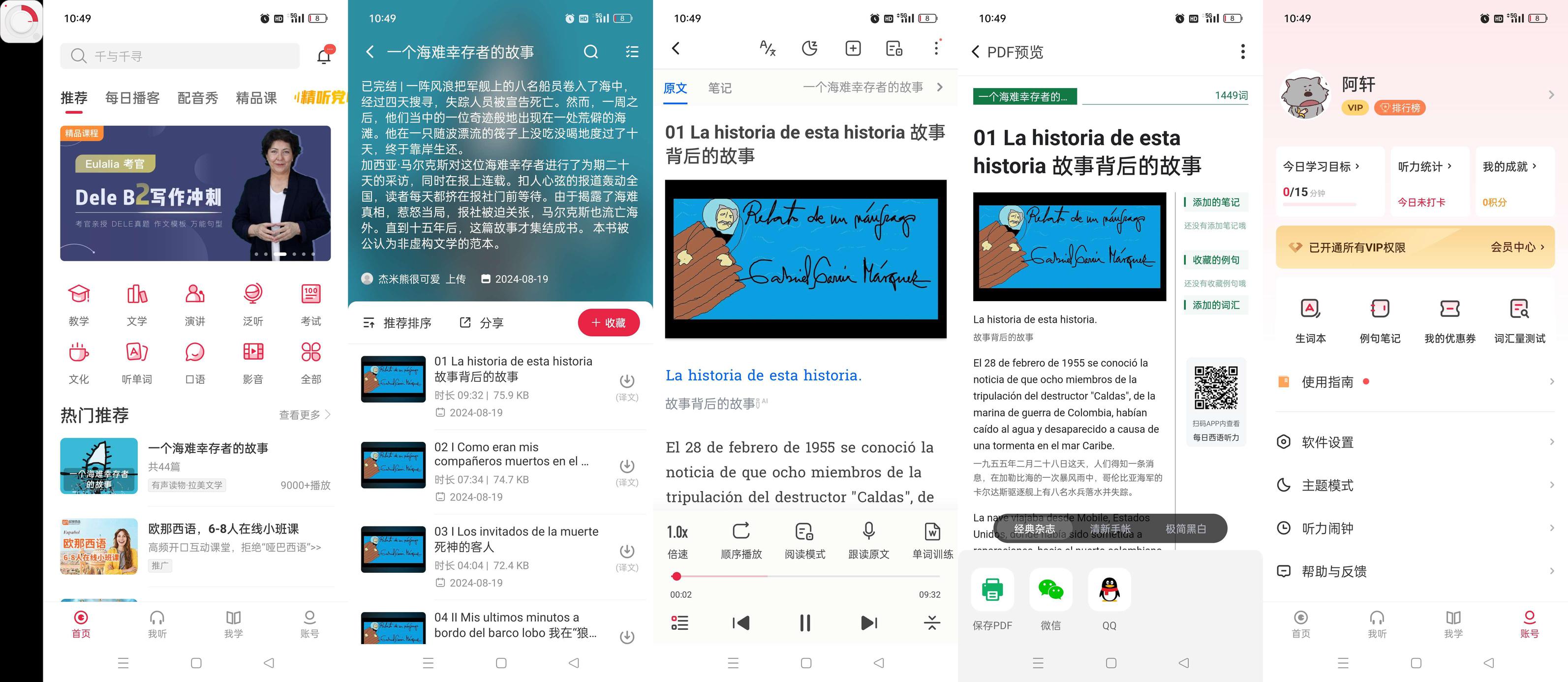 【官方介绍】:每日西班牙语听力,专为西语学习者打造,精听细读,助你更好学西语。 【资源丰富,每日更新】 - 资讯:每天为您推送西语媒体听力资源; - 经典教材:听力、口语、词汇、语法、公开课等实用西语教材;DELE、专四、专八备考教材; - 兴趣学习:有声读物、名人演讲、公开课、影视英语等丰富西语资源。 【功能强大,操作简便】 - 划词搜索:与《西班牙语助手》无缝集成,长按查词,即指即译; - 播放调节:8档语速调节、4种循环模式,单句精听、听写、测验,满足不同阶段学习需求; - 收藏下载:支持下载,离线随时收听; - 听力上传:支持听众在官网上传自己的资源和同步高亮字幕; - 跟读打分:跟读后可查看单词发音准确度,纠正发音问题。 【特色模块,辅助学习】 - 精听党:名著原声朗读,精编版讲义讲解,配套习题测试。 - 配音秀:提供原声听力材料的配音,秀出你的发音; - 学习计划:定下小目标,每天自动推送学习内容; - 听力挑战:加入听力训练计划,日积月累提高西语。