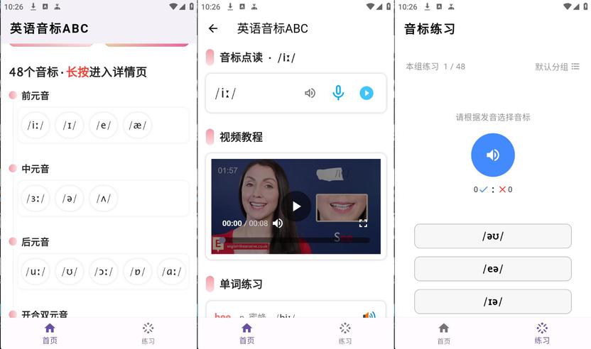 【软件介绍】:英语音标ABC是一款专为初学者设计的英语音标学习软件,适用于Android设备。无需注册登录,界面简洁明了,非常适合零基础用户从浅入深地学习英语音标。软件支持26个字母和48个音标的发音学习,每个音标都有详细的点读、视频教程、相似单词发音练习和文字版教学,还有针对性的音标练习功能,帮助用户在学习过程中不断巩固所学知识。