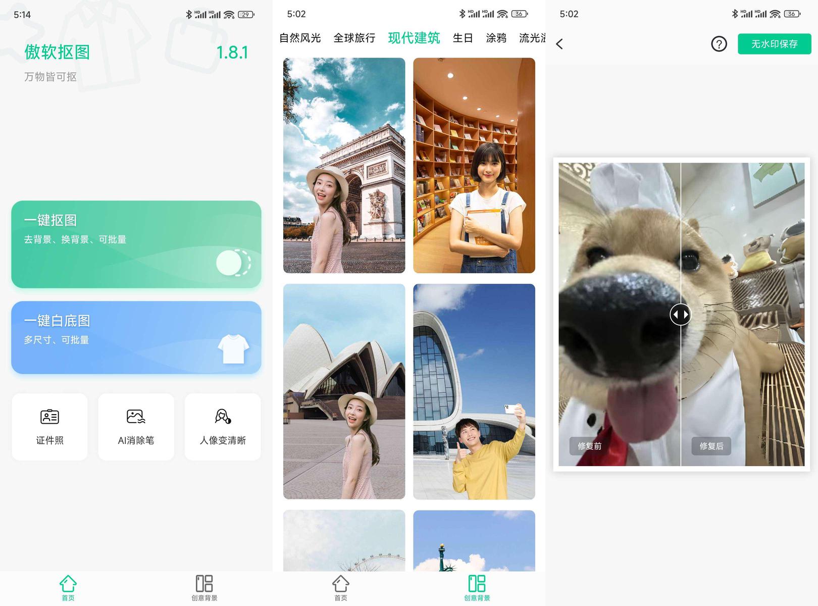 【官方介绍】傲软抠图是一款专为抠图打造的App抠图软件,它可以自动识别图片中的人物或物体,并从原图中抠出透明背景图像,同时提供抠图工具进行精确修剪,是您抠图的最佳选择。