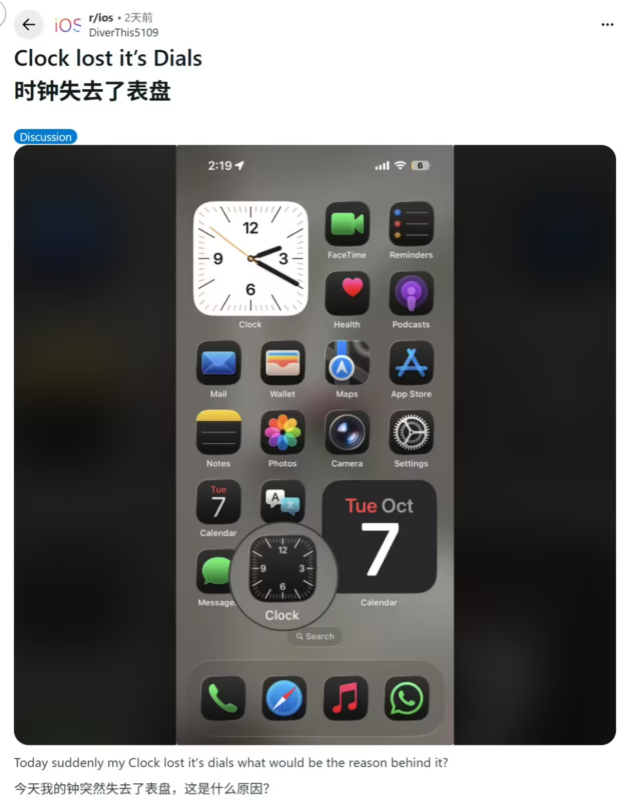 有报告指出,使用深色壁纸会使该问题更加明显。这是因为当图标与背景形成高对比度时,时钟指针更容易与背景的反射效果混淆,从而造成指针“消失”的错觉。查询该帖子网友回复,发现还有时钟指针存在,但时间刻度消失的情况。