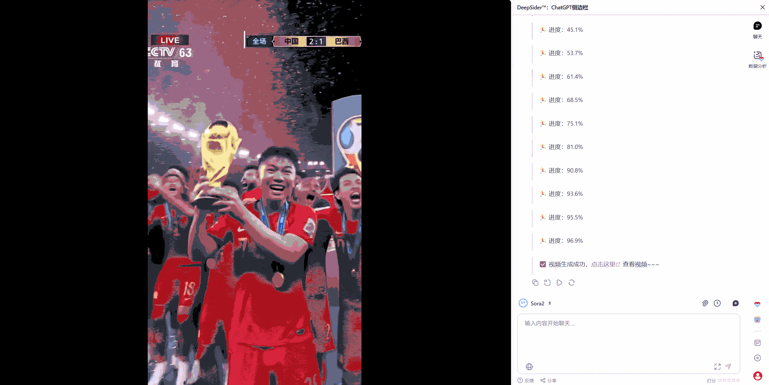 现在、立刻、马上打开浏览器,你就可以在浏览器插件DeepSider中,直接跑上Sora2模型,以对话的形式来生成视频!