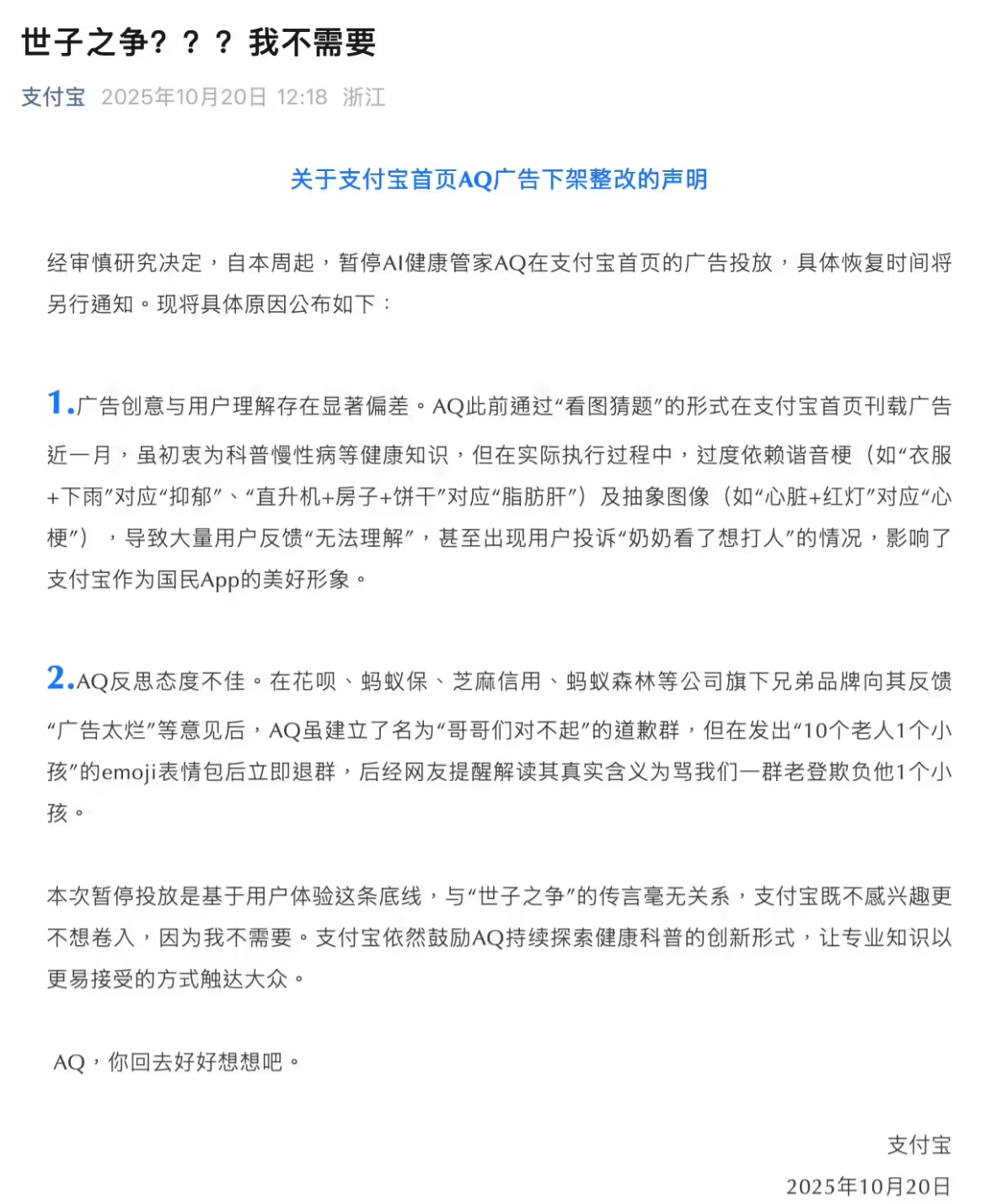目前支付宝官方公众号发文,宣布自本周起暂停 AI 健康管家 AQ 在支付宝首页的广告投放,具体恢复时间将另行通知。