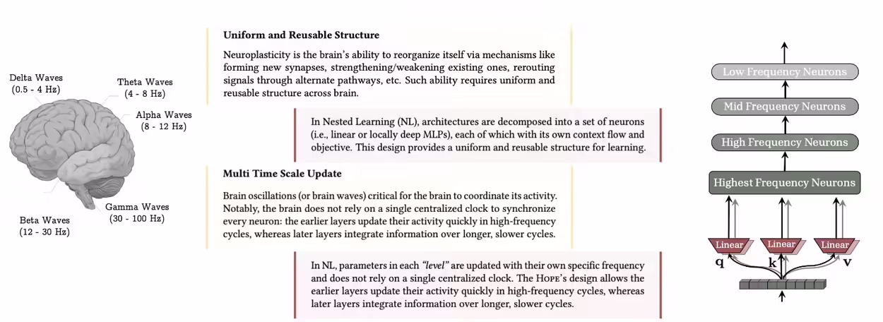 第二是“连续体内存系统”(Continuum Memory Systems,CMS),它将模型的内存视为一个由多个不同更新频率的模块组成的光谱,从短期记忆平滑过渡到长期记忆,创建了一个更丰富、更高效的持续学习内存体系。