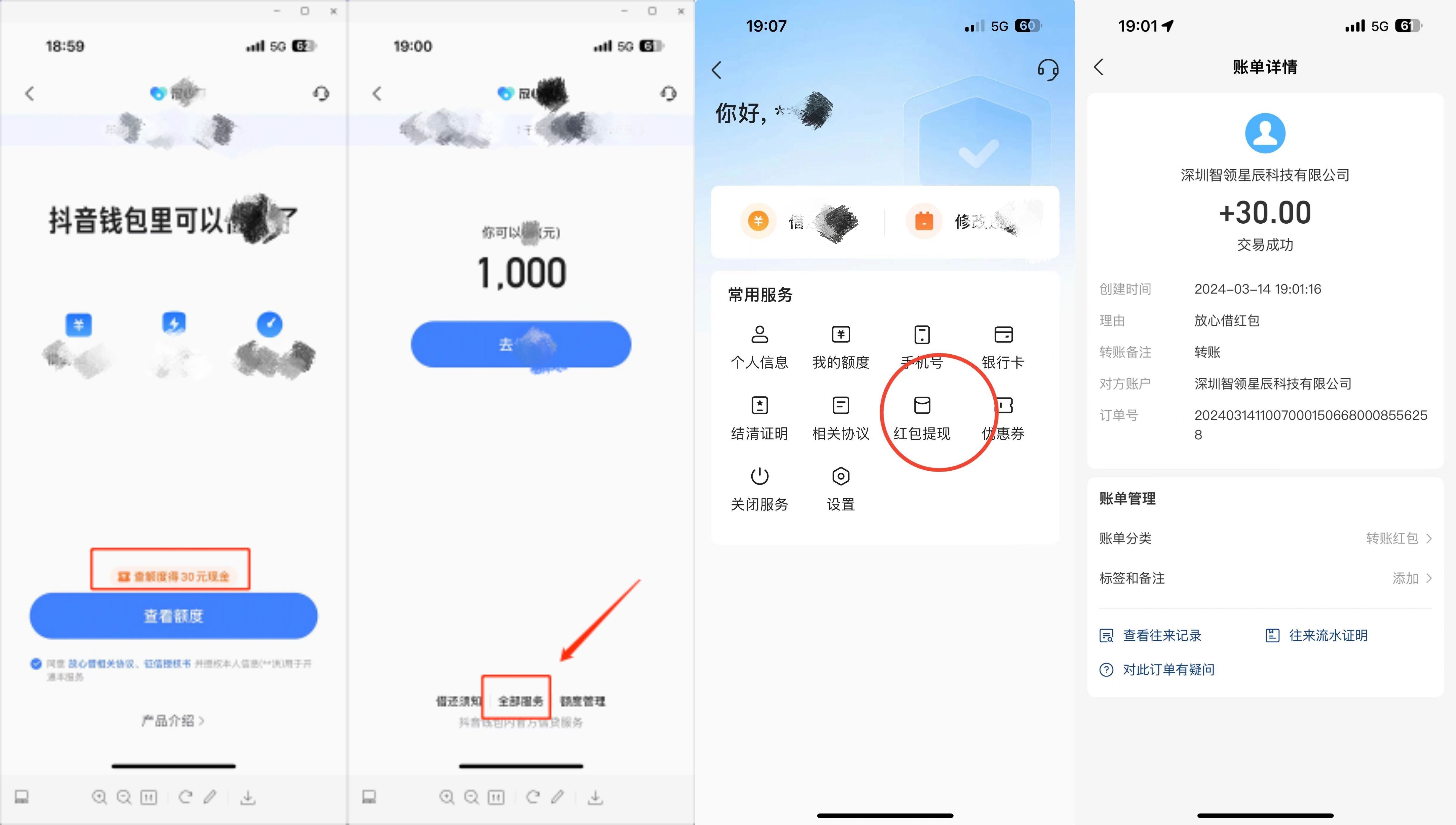 抖音APP->我的钱包->放心借->查看额度得30元现金->查看即可->(没有30元显示别玩)->仅限部分用户可以玩->我的->红包提现即可